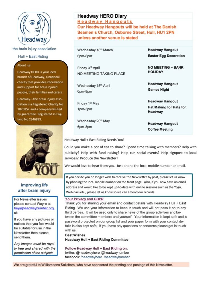 Headway Hull & East Riding’s newsletter for March is now available, just click on the link below to download.